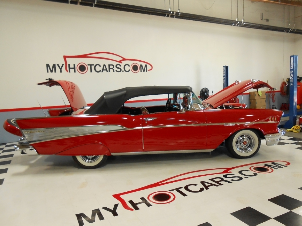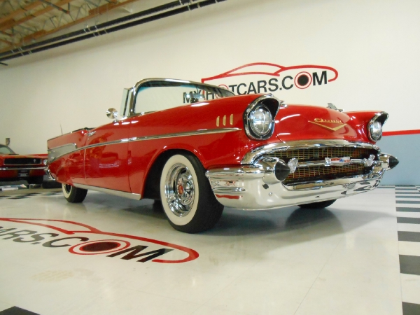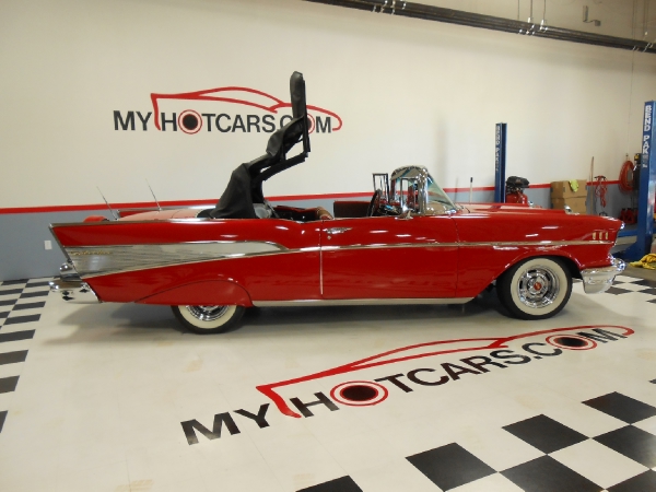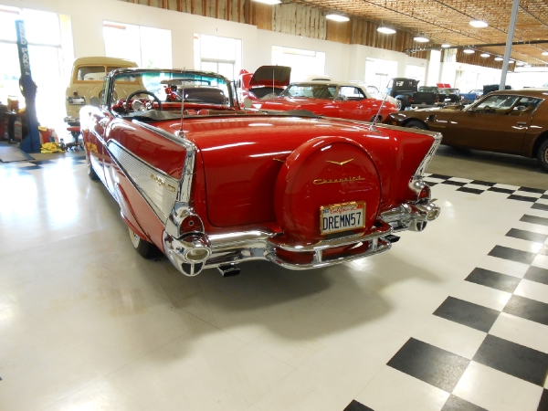 Dreaming '57 that's the personalized license plate and it really captures this very nice 1957 Chevrolet Bel Air Convertible. Restored with a 350 V - 8 engine Edelbrock intake with Edelbrock carburetor. MSD ignition. Aluminum radiator with auxiliary electric cooling fan. Jet coated headers. Power steering. Power front disc brakes with Mustang II front end. Upgraded Classic Industries tachometer and gauges. Power soft top. Continental kit. Dual rear antennas. Cooker wide white wall tires. Rear fender skirts. Perfect for summer time drive ins. Looks and drives like a dream!!! Call us at MY HOT CARS INC. 925-292-0922 or 1-800-900-0227. Email us at: [email protected]. Like us on FACEBOOK and follow us on TWITTER too. MY HOT CARS INC. The Premier Classic and Muscle Car Dealer. For the past 25 years we have been helping customers from all around the world get the car of their dreams. We get RESULTS!!New Inventory Arriving Every Day. www.myhotcars.com