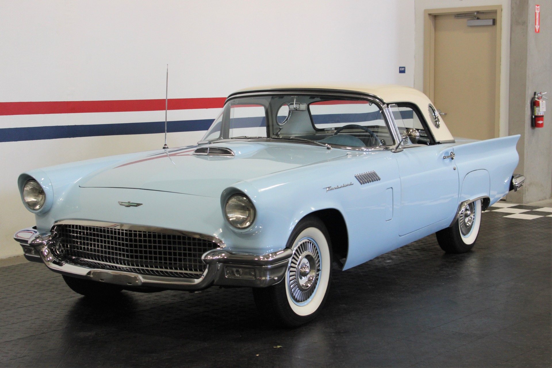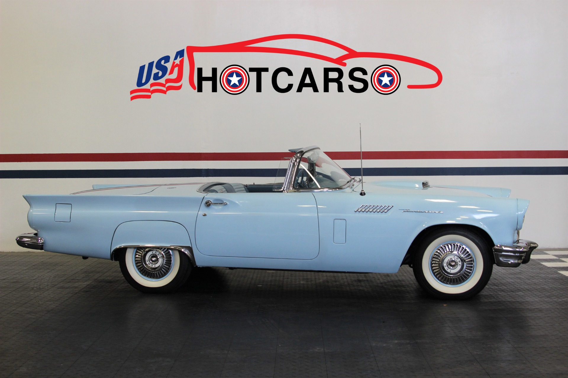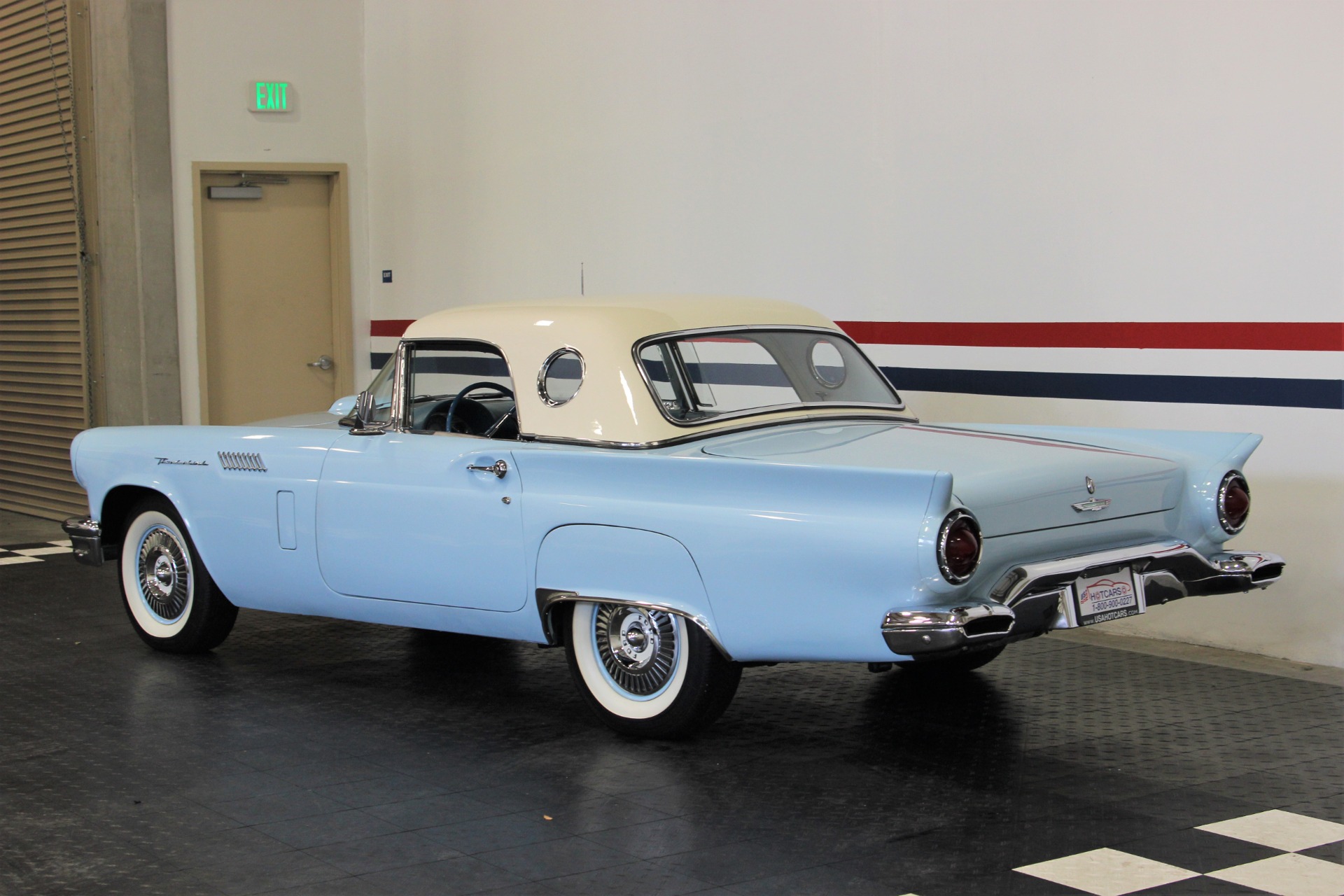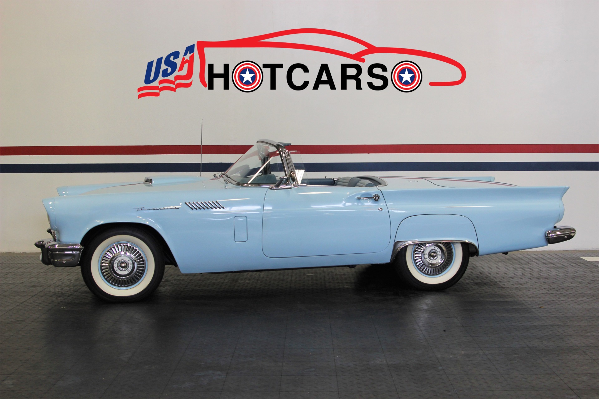 312 CID. Engine. 3 Speed Manual Transmission with Overdrive. Dual 4BBL Carburetors. Chrome Thunderbird Finned Valve Covers. Dual Exhaust. Two Toned Blue Interior. Padded Dashboard. AM/FM Stereo. Factory Spare and Jack. 15 Inch Steel Wheels with Factory Center Caps. Coker White Wall Tires. Only 1449 E Code Thunderbirds Built in 1957. If you are in the market for that special car then come to our showroom in San Ramon, CA. Make your dreams a reality, call the USA Hot Cars Team Today
